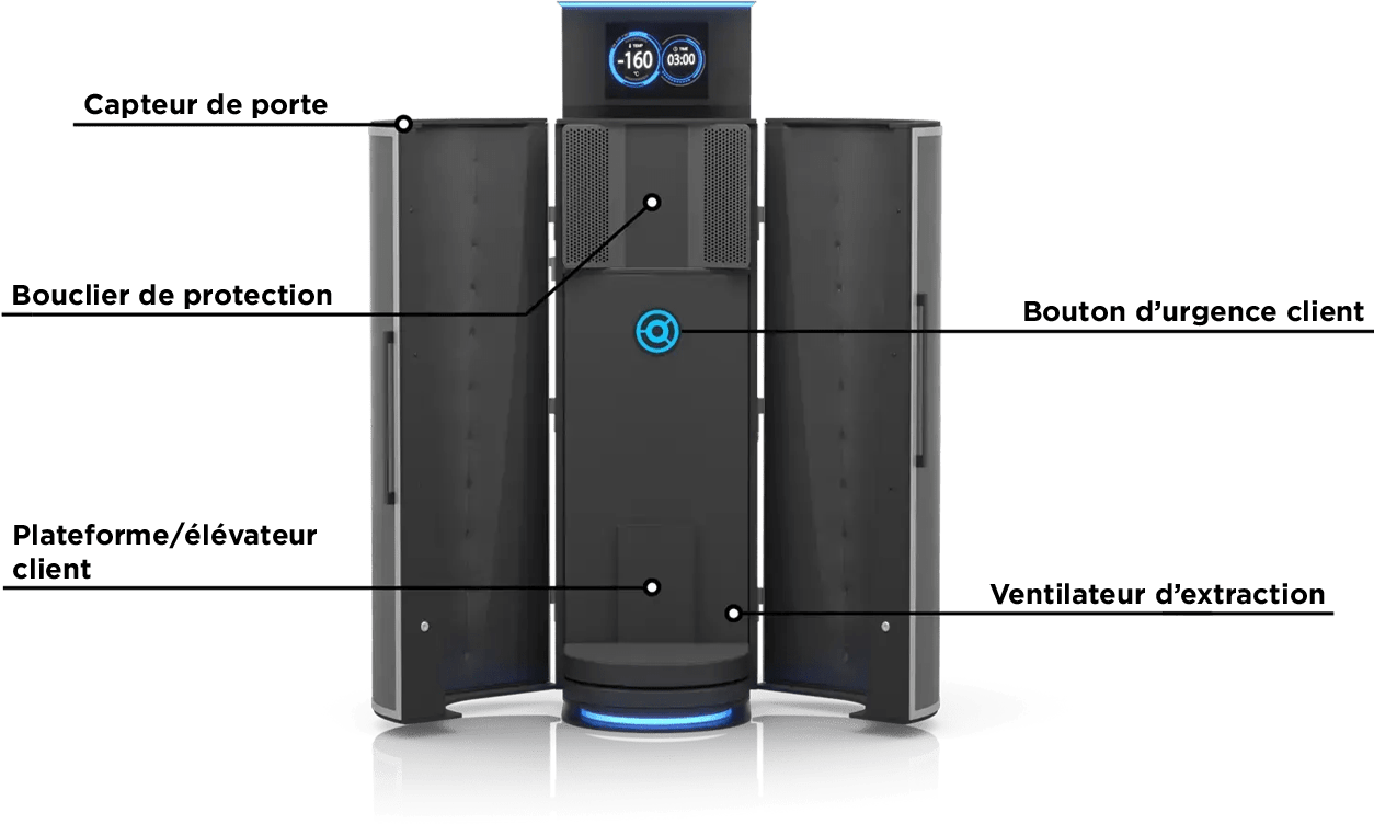 | Un environnement contrôlé à l'intérieur de la cabine cryogénique | Le système est conçu pour diffuser de l'air frais de manière uniforme dans l'ensemble de la cabine et pour maintenir la température souhaitée pendant toute la durée de la séance. La température intérieure de la cabine ne peut à aucun moment dépasser le niveau de sécurité. |