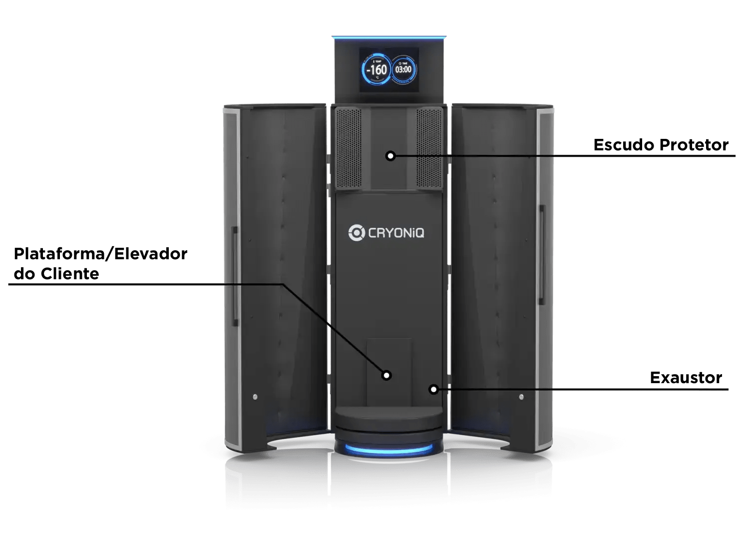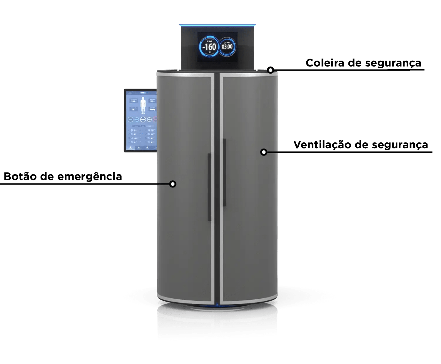 Recursos de Segurança contruídos para segurança adicional para o utilizador durante um tratamento na cabine de cryo. Estes recursos dão ao cliente um nível de controlo sobre a sessão e dão ao operador as ferramentas que ajudam a assegurar o bem-estar dos clientes.